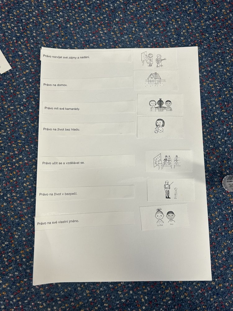 Tématem byla lidská práva a jak je uplatňujeme v životě. Žáci si ve dvojicích vylosovali náměty na situace, se kterými se běžně setkávají a ty pak pomocí pantomimy předvedli ostatním. Všichni hádali, o jakou situaci jde. Poté společně diskutovali o tom, zda daná situace probíhala správně a jak by se v ní zachovali oni. Na závěr přiřadili danou skutečnost k jedné z definic dětských práv. Tu si pak nalepili na společný plakát, který bude zároveň sloužit jako výzdoba třídy. V závěrečném shrnutí se všichni shodli na tom, že každý máme nejen práva, ale také povinnosti, které z těchto práv vycházejí a pokud je budeme mezi sebou dodržovat, budeme žít v bezpečném prostředí, kde budou přátelské vztahy a radostná atmosféra.