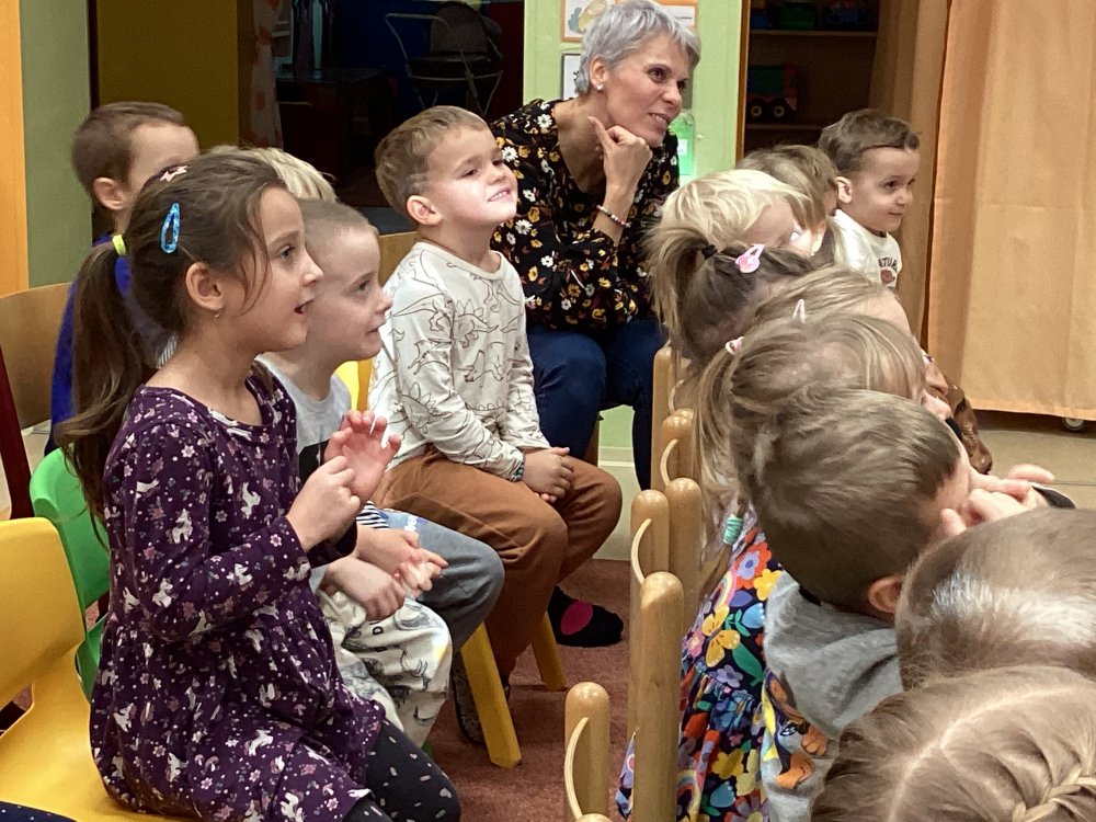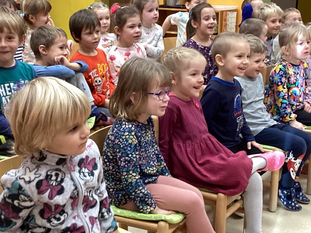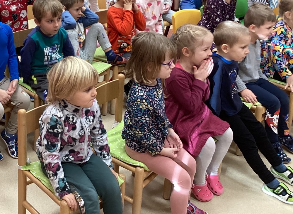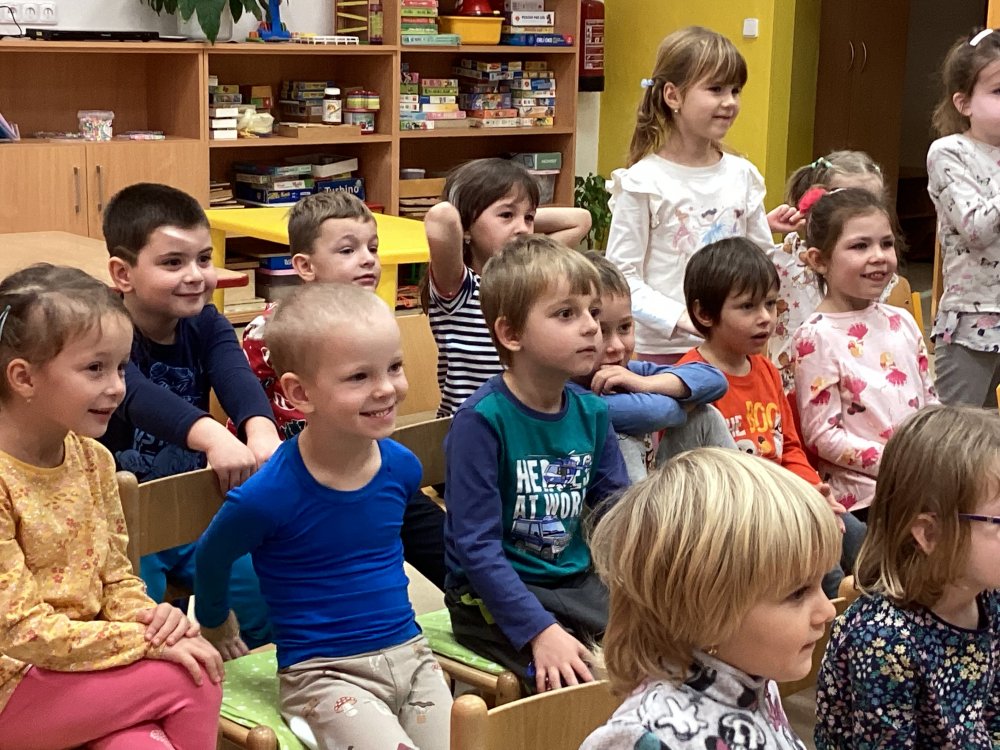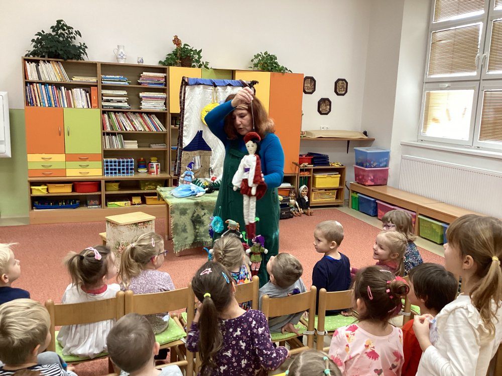 Děti se od rána těšily na milé setkání a hlavně na pohádky, které nám paní Sasínová přivezla. Pozvali jsme také děti z dětské skupinky, takže nás byla opravdu plná školka. Viděli jsme celkem tři pohádky- „O kominíčkovi a Majdalénce“, „O Sněhurce a sedmi trpaslících“ a „O Otesánkovi“. Děti se nasmály a také občas asistovaly paní herečce při hraní. Zase se budeme těšit na další pohádky, tentokrát možná někdy na jaro.