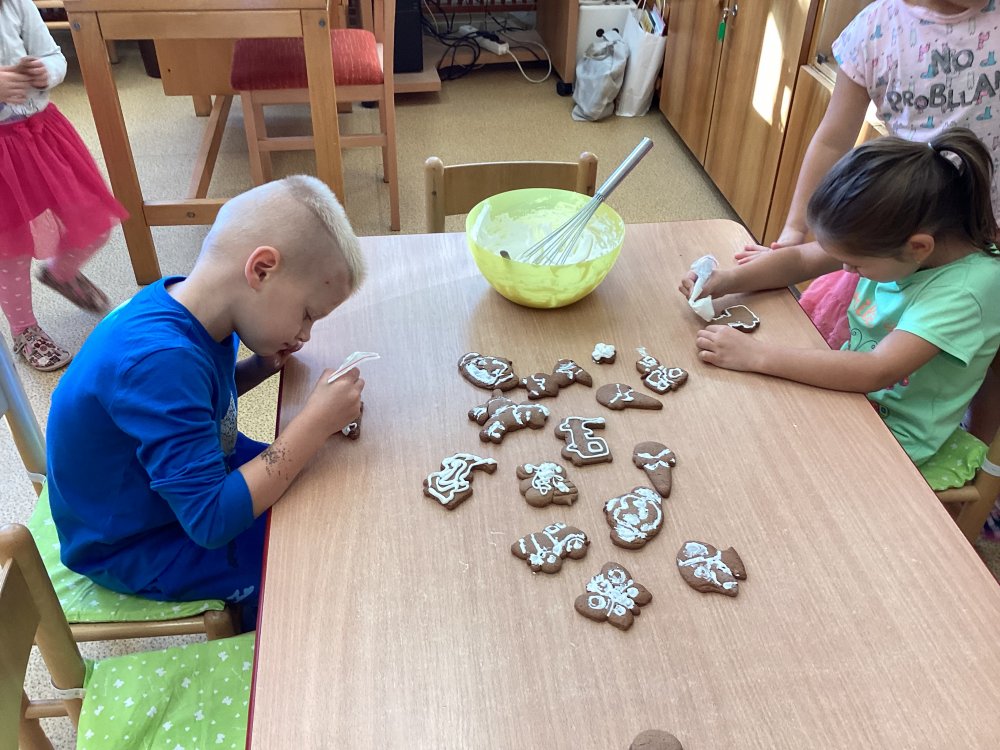 Nejdříve se děti pustily do přípravy těsta. Pomáhal jim názorný obrázkový recept, který jsme si předem připravili a nalepili. Při míchání a následném hnětení těsta se děti postupně střídaly. Hned zjistily, kolik je třeba vynaložit úsilí, aby bylo těsto krásně zpracované a připravené k vykrajování požadovaného tvaru. Pak někteří těsto váleli válečkem, další vykrajovali tvořítky nebo modelovali dle své fantazie. Další děti skládaly vykrájené perníčky na plech. Společně jsme je předali paní kuchařkám s prosbou, aby nám je v kuchyni upekly. Nakonec jsme je nazdobili polevou a s náramnou chutí snědli.