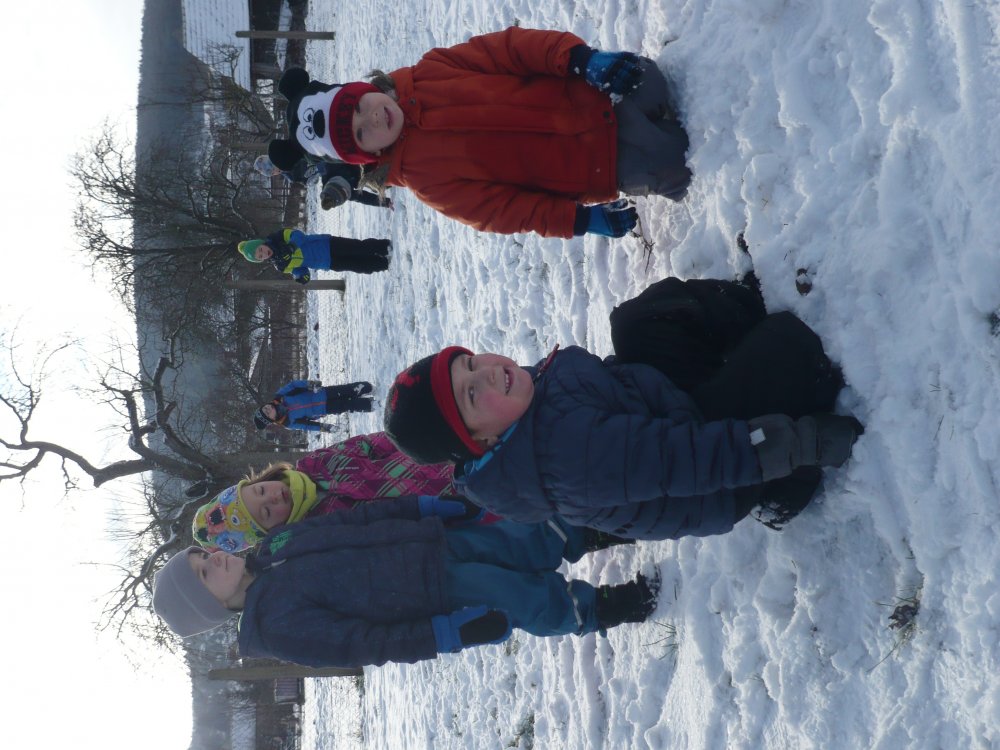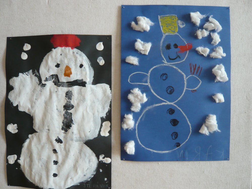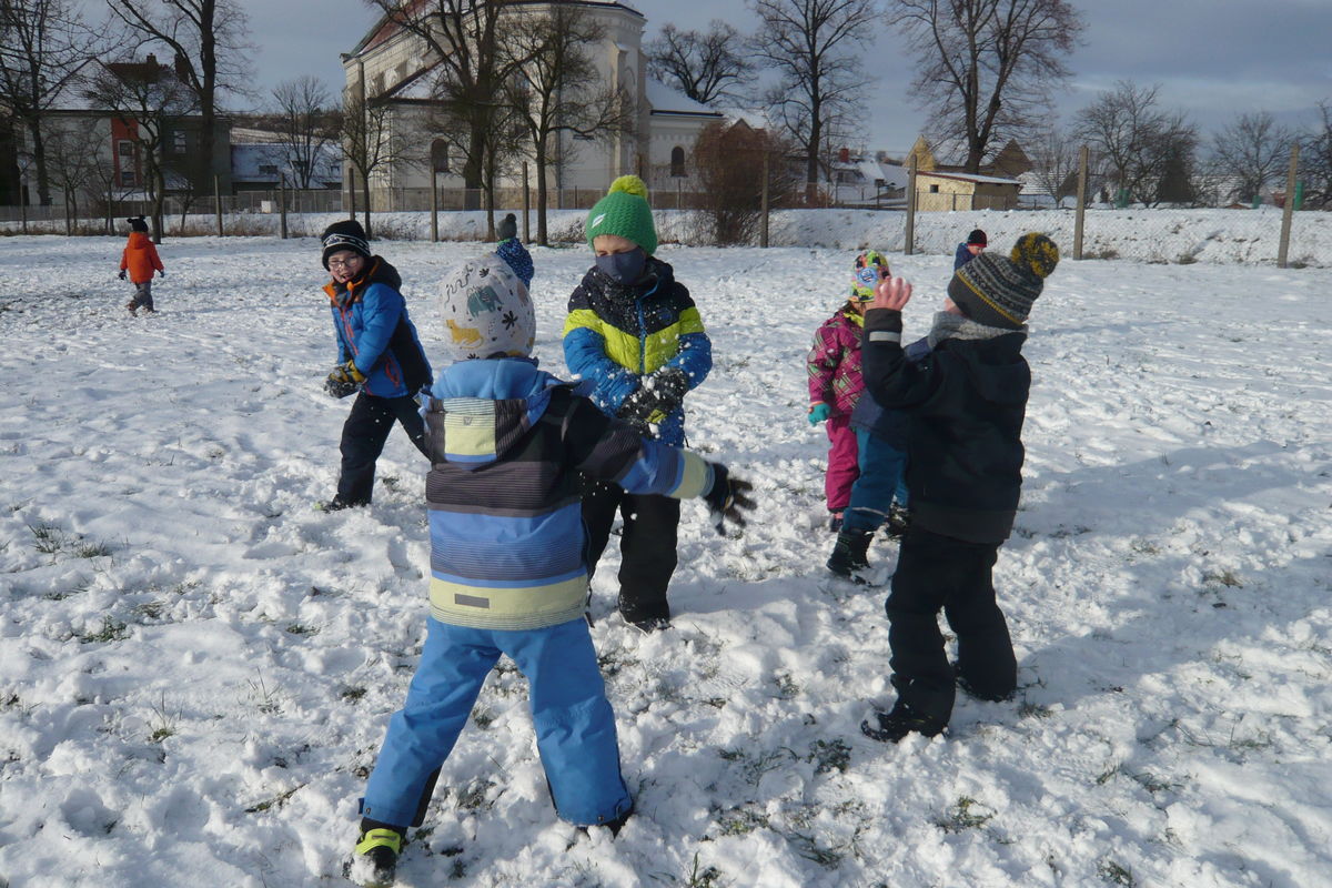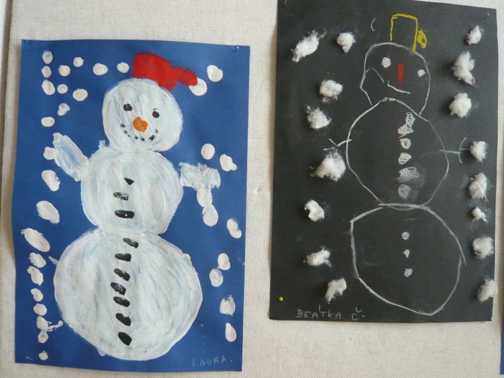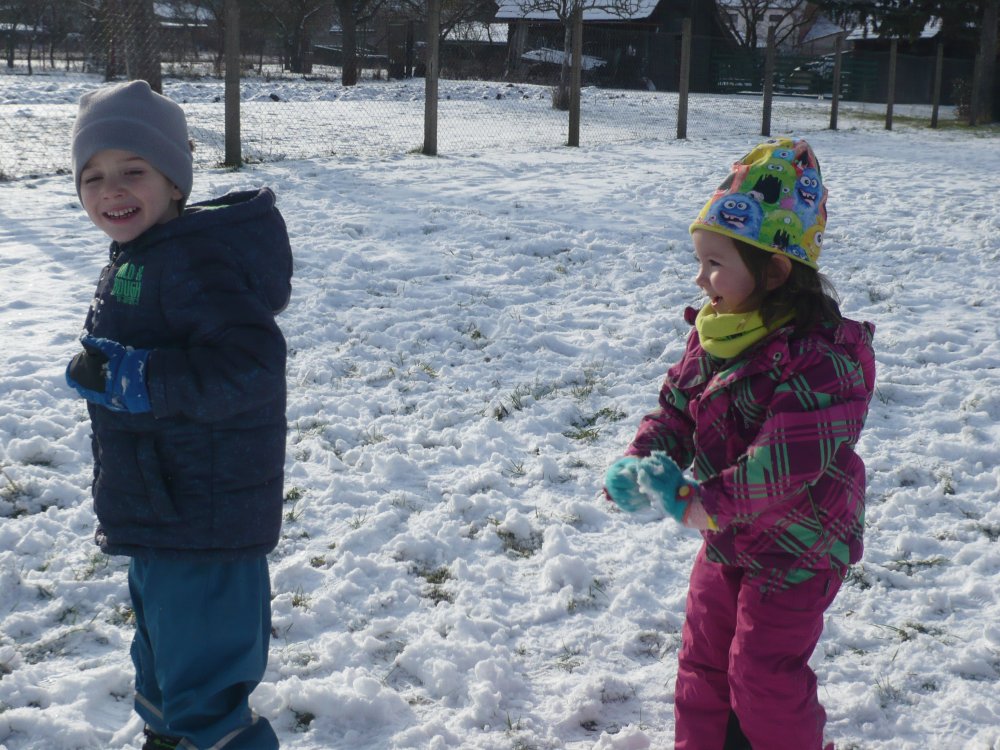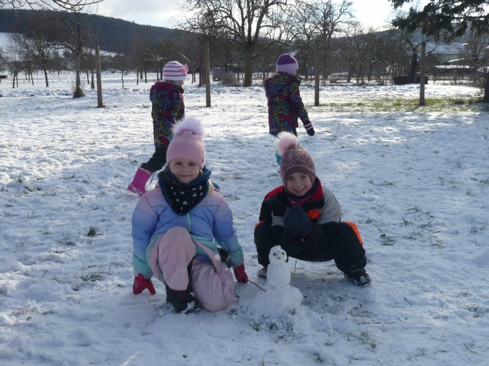 Při hrách se sněhem na zahradě zjistily, že postavit sněhuláka není jen tak. Ve třídě prováděly pokus se sněhem. Sníh a led se v teple rozpustil na vodu a tak poznaly další skupenství vody. Tvořili jsme obrázky se sněhuláky a zimní rukavice. Děti se naučily nová říkadla, pohybové hry a písničky se zimní tématikou.