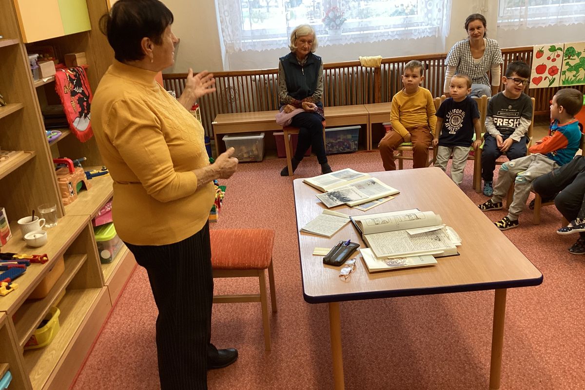 Paní Krhovská (kronikářka Radějova) s paní Káčerkovou (naší bývalou školní kuchařkou) nám přišly povyprávět, jak dříve Radějov vypadal, jak se zde žilo, co všechno měli lidé na starost a jak i děti musely doma pomáhat. Děti si dokonce zatančily s paní kronikářkou taneček „O Včelínku“. Zkusily si také některé části z kroje, které jim přinesla ukázat paní asistentka Gábka. V těchto dnech si o naší vesnici povídáme i ve školce v tématu „Naše vesnice a její tradice“. Vyrobili jsme si společně mapu Radějova, naučili jsme se k hodám písničku „V Radějově hody budú“ a zkusíme i upéct svatomartinské hodové rohlíčky. Už se na ně moc těšíme.