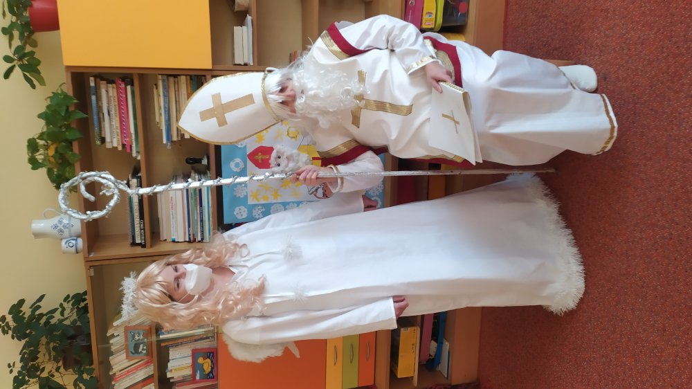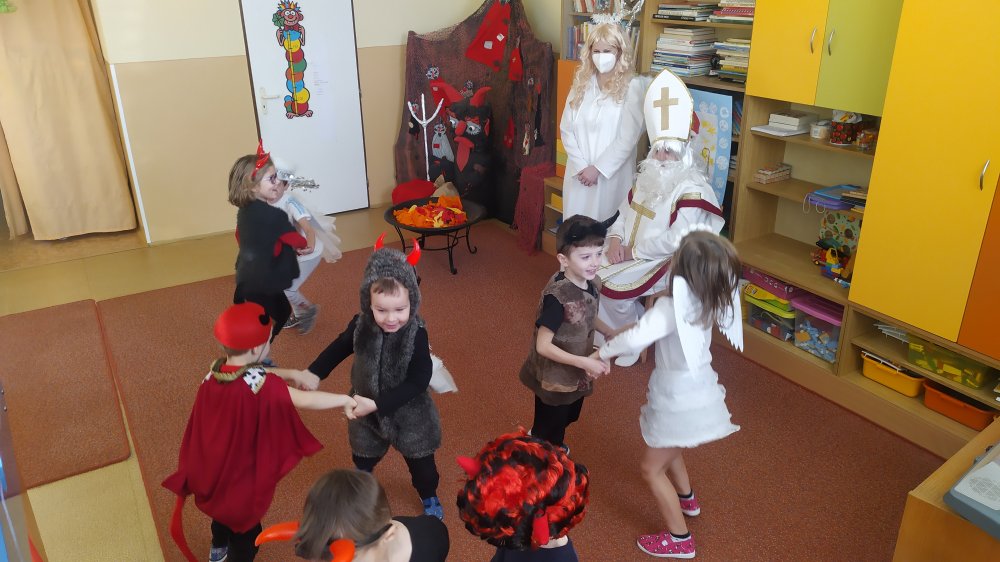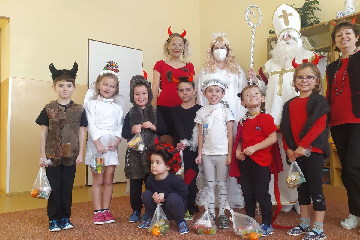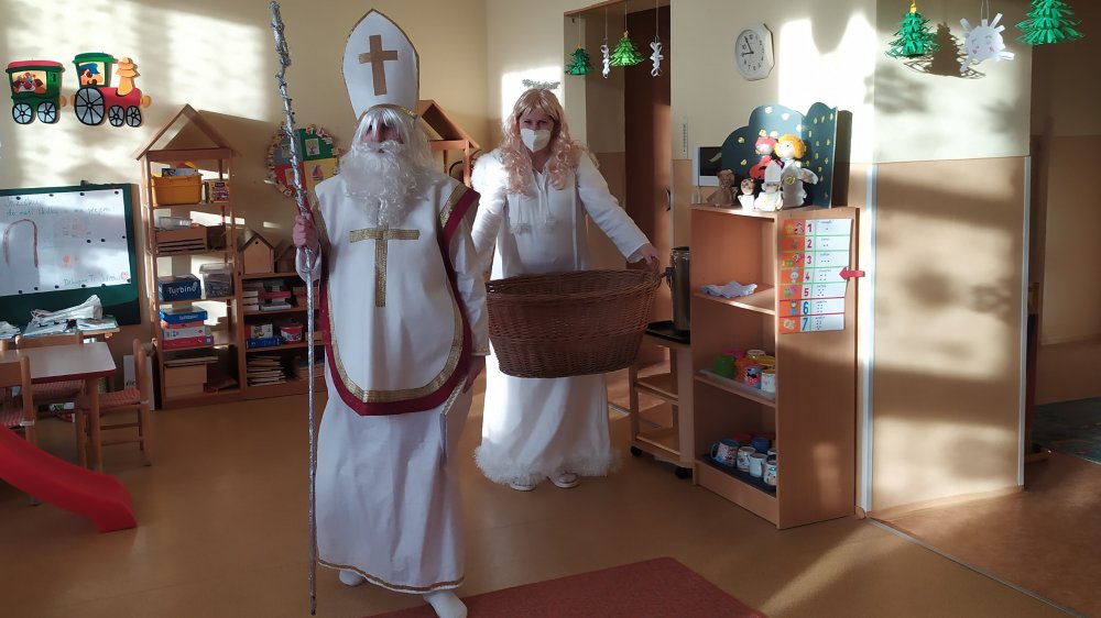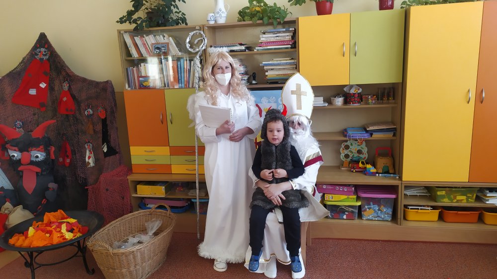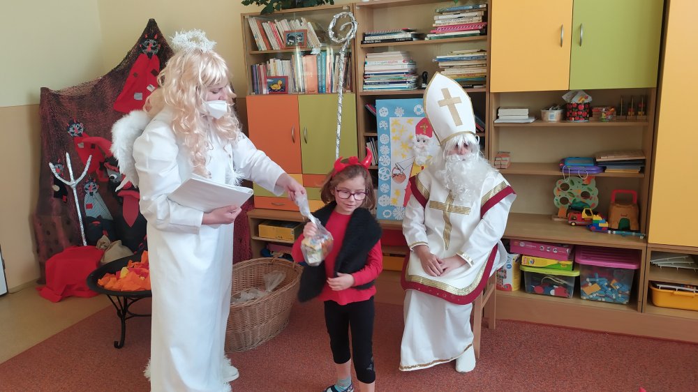 Letos přišel pouze v doprovodu anděla. Čerta prý nechal raději venku před školou. Po překonání prvotních obav jim děti zazpívaly písničky, přednesly básničky a zatančily tanečky. Za odměnu dostaly od andělíčka sladkosti. Děkujeme paní uklízečce Janě Kadleczové (Mikuláš) a paní kuchařce Lence Vavříkové ( anděl), že i v této době dětem připravily pěknou besídku. Také děkujeme paní kuchařce Janě Svejkovské za to, že pro děti přichystala balíčky se sladkostmi a v jídelně velké překvapení - adventní kalendář.
