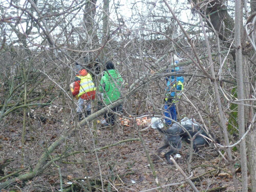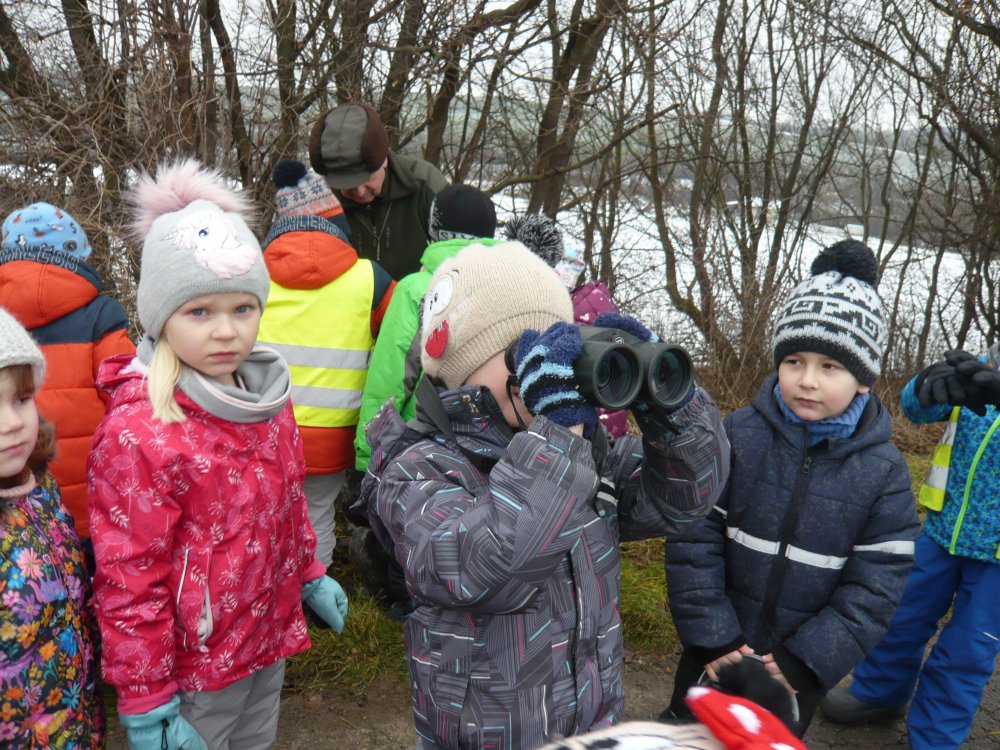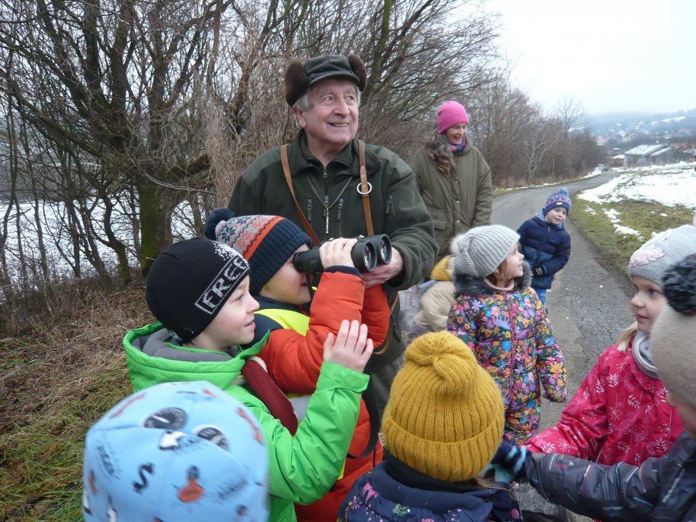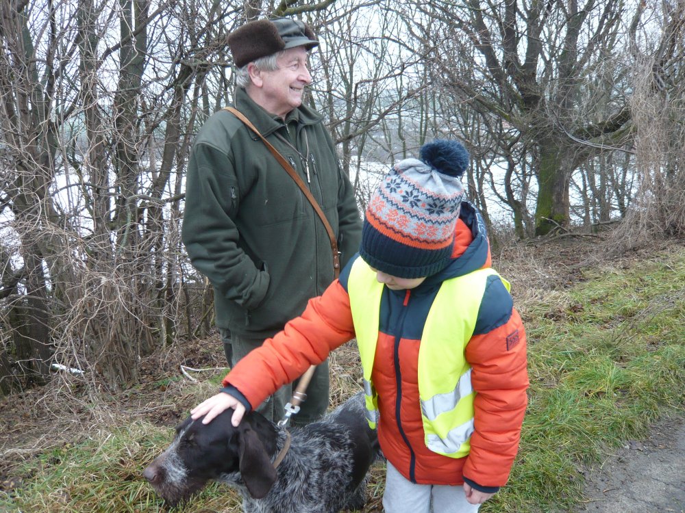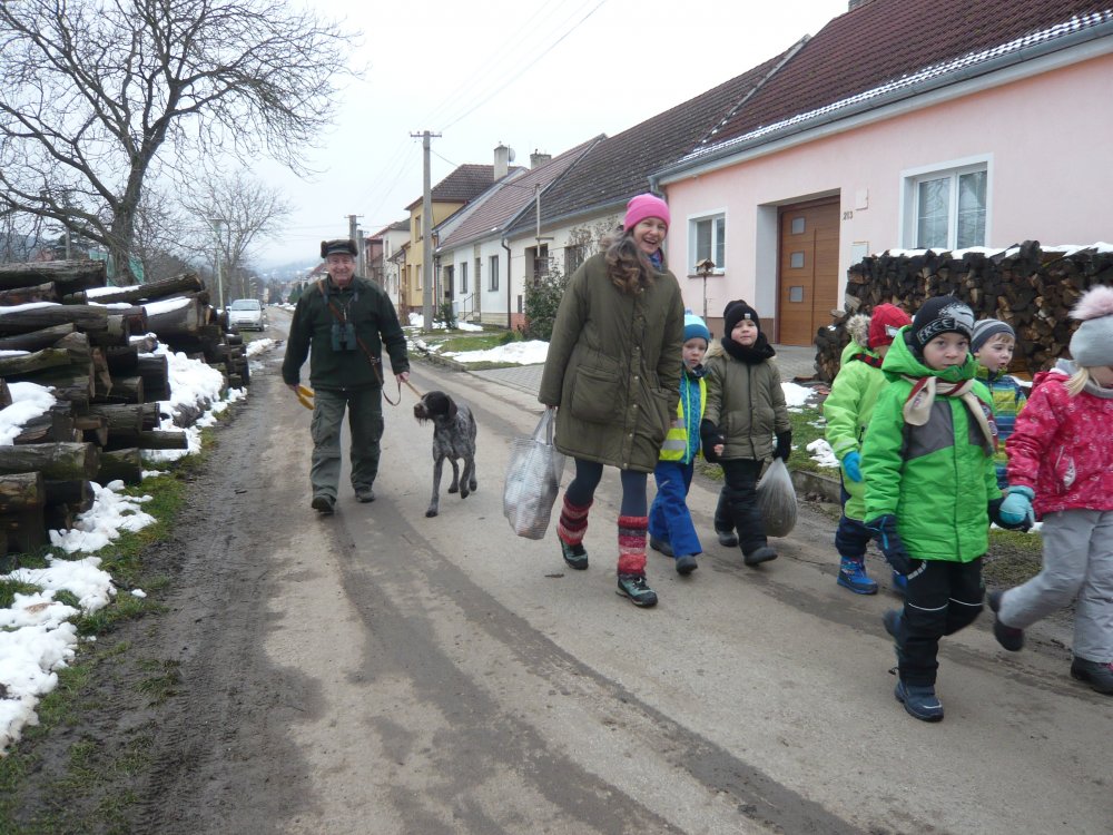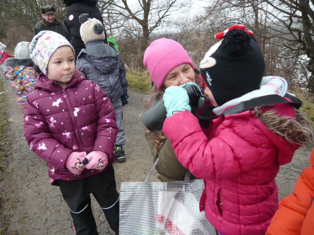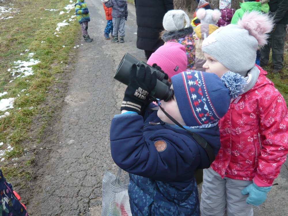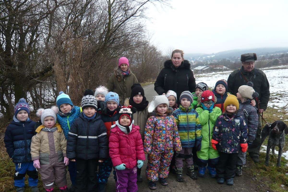 Proto jsme se rozhodli ve středu 25. 1. poprosit pana Nováka, jestli by s námi šel na vycházku ke krmelci. Děti od rána nosily spousty dobrot pro zvířátka a nemohly se dočkat, kdy už vyrazíme. Byly nadšené, protože se dověděly, že pan Novák vzal s sebou i svého loveckého psa Fanynku. Společně jsme přišli ke krmelci u cyklostezky a všechny dobroty jsme zvířátkům nasypali. Sledovali jsme opravdovým dalekohledem srnky a káně a zjistili jsme, jak se provádí výcvik loveckého psa. I když počasí nebylo zrovna ideální a bláto jsme měli skoro všude, všichni jsme si vycházku náramně užili a vraceli jsme se s dobrým pocitem, že jsme našim zvířátkům přinesli něco dobrého na zub.