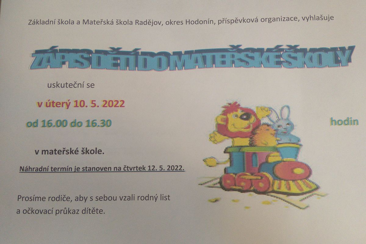 Základní škola a Mateřská škola Radějov, okres Hodonín, příspěvková organizace, vyhlašuje zápis dětí do mateřské školy, který se uskuteční v úterý 10. 5. 2022 od 16.00 do 16.30 hodin v mateřské škole. Náhradní termín je stanoven na čtvrtek 12. 5. 2022.