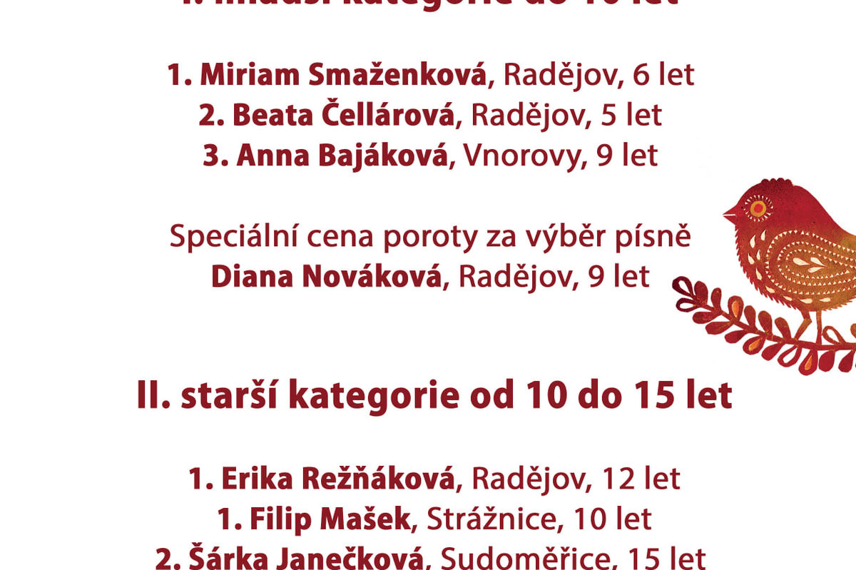 Letos se ho již naživo zúčastnilo celkem 31 zpěváčků, z toho Radějov a radějovskou školu reprezentovalo 14 šikovných dětí! - Beata Čellárová, Andrej Čellár, Anna Dvořáková, Jakub Dvořák, Karin Kapinusová, Marika Liferenková, Julie Lovecká, Diana Nováková, Laura Nováková, Miriam Smaženková, Ema Zahradníková, Julie Nováková, René Novák a Erika Režňáková. Zpěváčci byli rozděleni do dvou kategorií. V první kategorii do deseti let zvítězila a porotou byla vybrána Miriamka Smaženková, která dále postupuje na Zpěváčka Slovácka v Archlebově. Druhé místo obsadila Beatka Čellárová a speciální cenu za výběr písně dostala Dianka Nováková. Ve druhé kategorii od deseti let první místo získala Erika Režňáková a zároveň získala postupový klíč pro zpěváčky lidových písní na Slovácku ve věku 10-15 let pod názvem Děti a píseň Slovácka 2022, která se uskuteční 23.4.2022 ve Veselí nad Moravou. Velká gratulace vítězům i zpěváčkům, kteří se akce zúčastnili!
