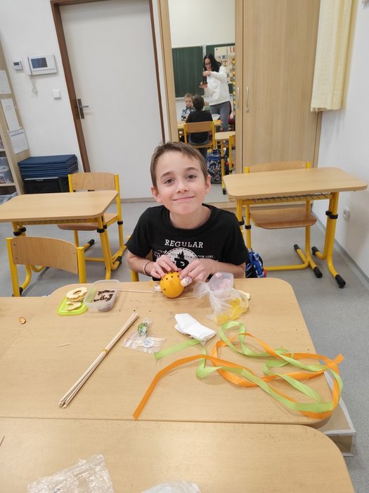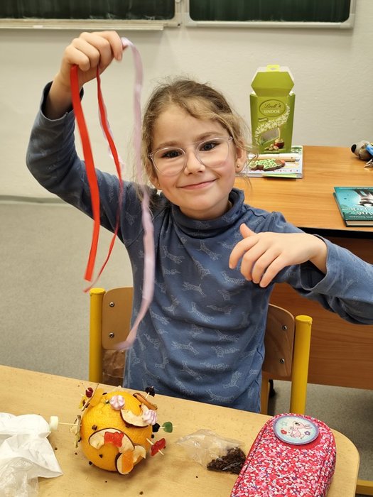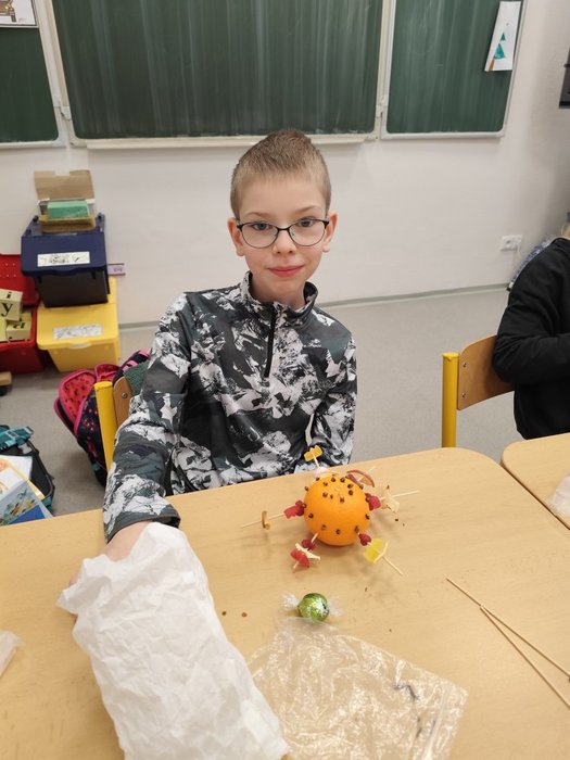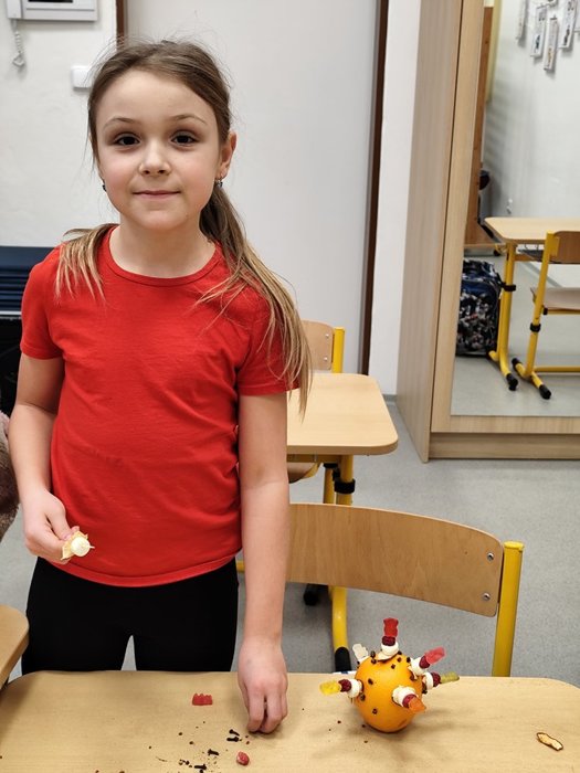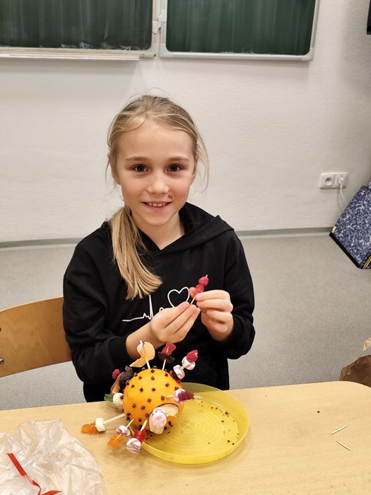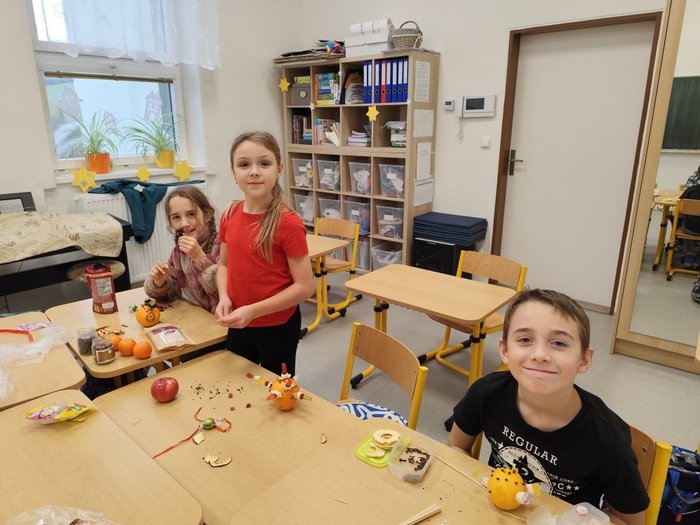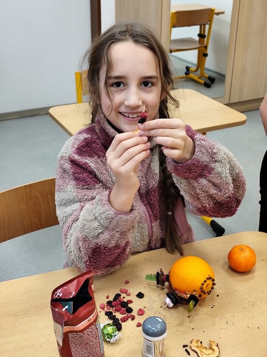 Kromě pečení jsme se pustili také do výroby voňavých vánočních dekorací z pomerančů. Žáci ozdobili pomeranče hřebíčkem, skořicí i jinými dobrůtkymi, a vytvořili tak voňavé ozdoby, které jim připomenou kouzlo Vánoc i doma.
