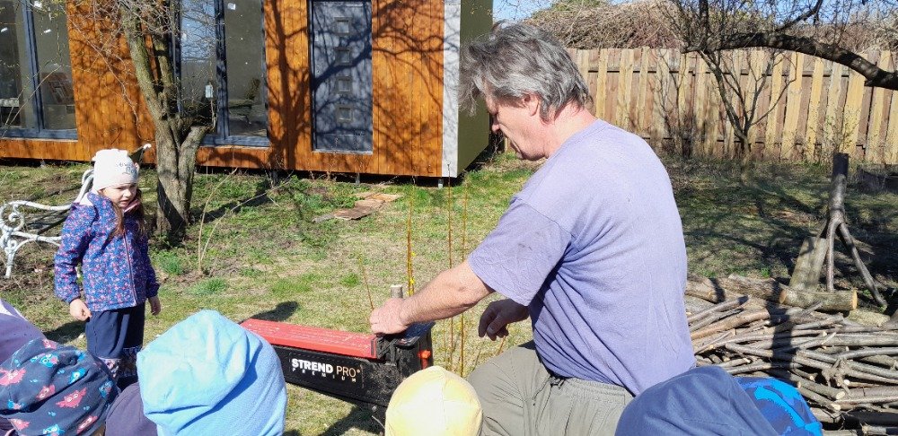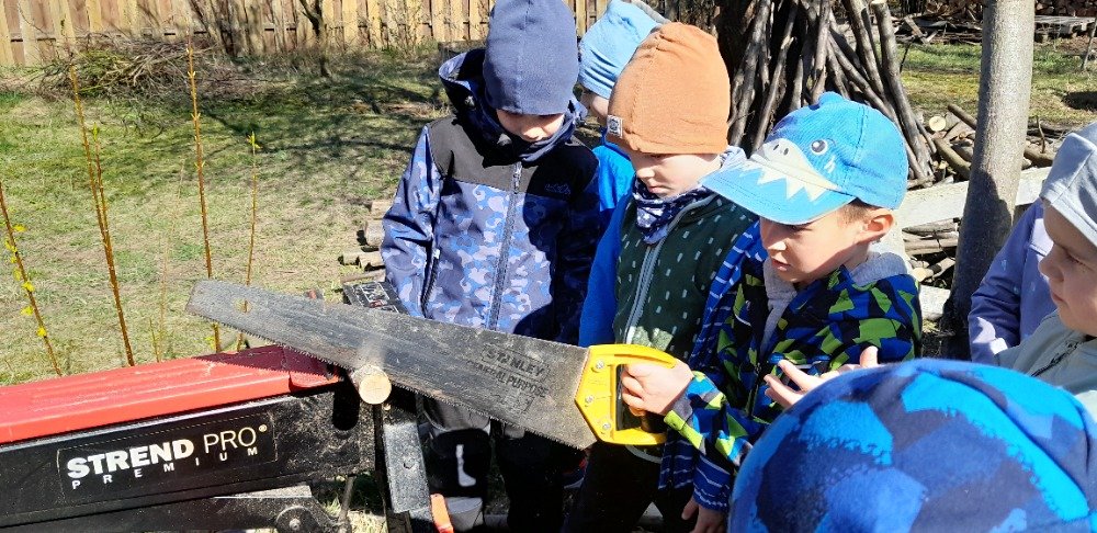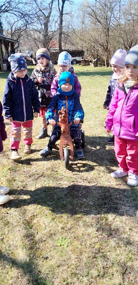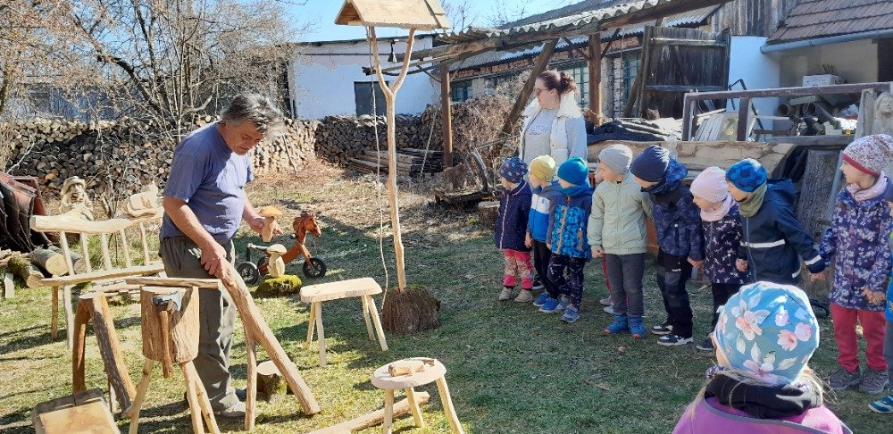 Děti se seznámily s různými nástroji a nářadím, které je potřeba při tvoření ze dřeva. Pan Cigáň jim vše názorně předvedl a také si nějaké nářadí mohly vlastnoručně vyzkoušet. Nejvíc všechny bavilo řezání pilkou. Obdivovali jsme zručnost a nápaditost, s jakou panu řezbáři vznikají krásné kousky pod rukama. Na závěr si děti zajezdily na kolečkovém dřevěném koníkovi.