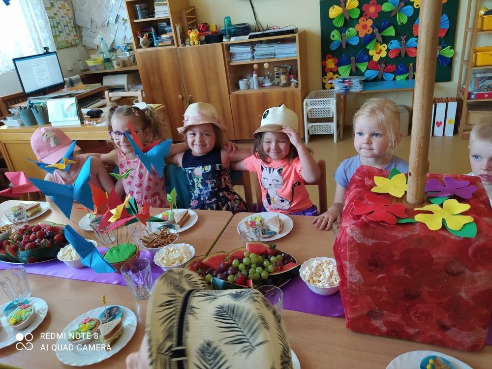 Třídu jsme si nazdobili barevnými motýlky a zmrzlinkami, děti měly k dispozici fotokoutek - zmrzlinový stánek. Paní kuchařky dětem nachystaly bohaté občerstvení – ovocné mísy, dezertík s jedlým papírem, muffiny, toasty a dětský šampus na přípitek. Předškoláci byli pasováni na prvňáčky, dostali šerpu se jménem a krásnou knihu: „Příhody veselých prvňáčků“. Moc jsme si tento slavnostní den plný her a zábavy užili.