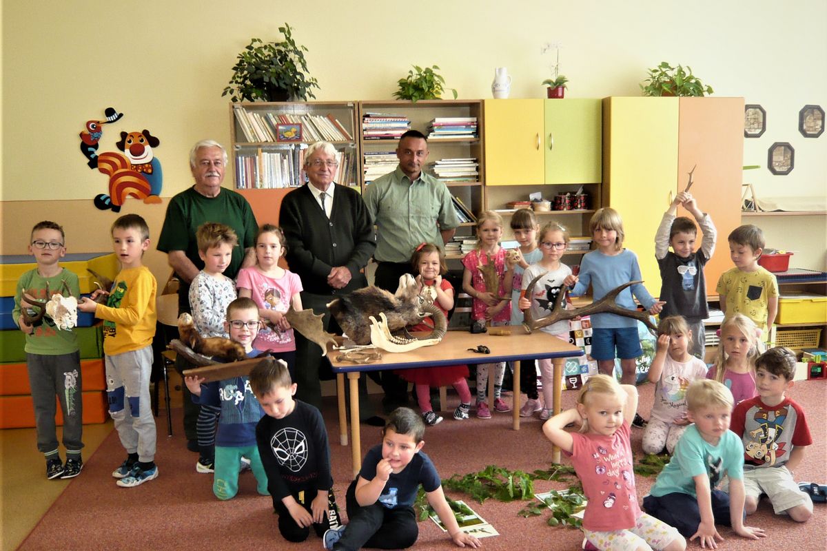 Myslivci zahájili besedu oborným výkladem, seznámili děti s pojmy a prací myslivce a hajného. Na ukázku dětem přinesli zajímavé trofeje – paroží srnce, jelena, daňka a několik vypreparovaných zvířat – muflona, tchoře. Děti si mohly prohlédnout různé druhy vábniček a vyzkoušet si dalekohled. Na ukázku jim myslivci přinesli také loveckou pušku a vysvětlili bezpečné zacházení se zbraní. Děti velmi zaujaly nové hádanky a mnoho zajímavých pojmů, které jim myslivci srozumitelně dokázali vysvětlit. Také poznávaly podle větviček druhy stromů. Dověděly se, proč je pro nás příroda užitečná a proč ji musíme chránit. Myslivci měli besedu připravenou na vysoké úrovni, k dětem měli pěkný přístup a snažili se jim předat hodně zajímavostí a zkušeností. Budeme se těšit na další společné setkání.