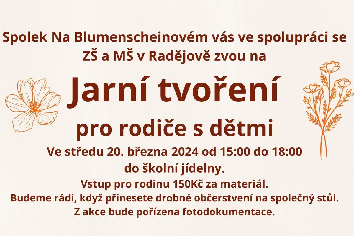 Spolek na Blumenscheinovém ve spolupráci se ZŠ a MŠ Radějov zvou na Jarní tvoření ve středu 20. března 2024 od 15 do 18 hodin ve školní jídelně. Vstup pro rodinu s dětmi 150 Kč za materiál.