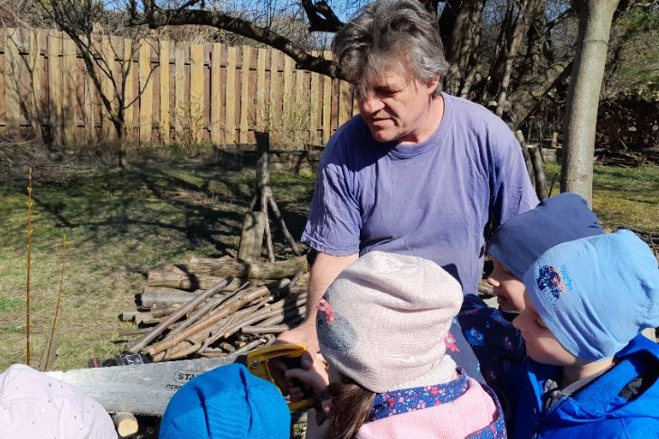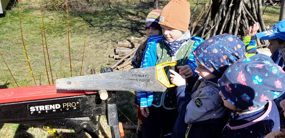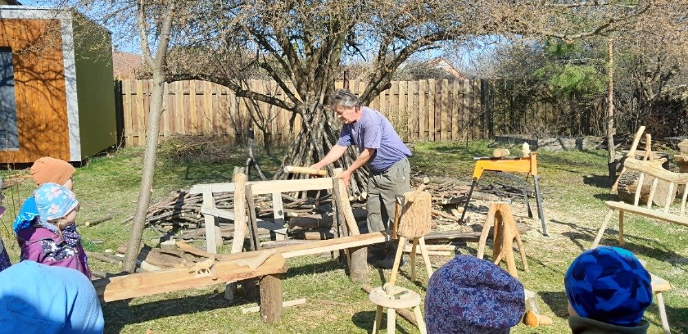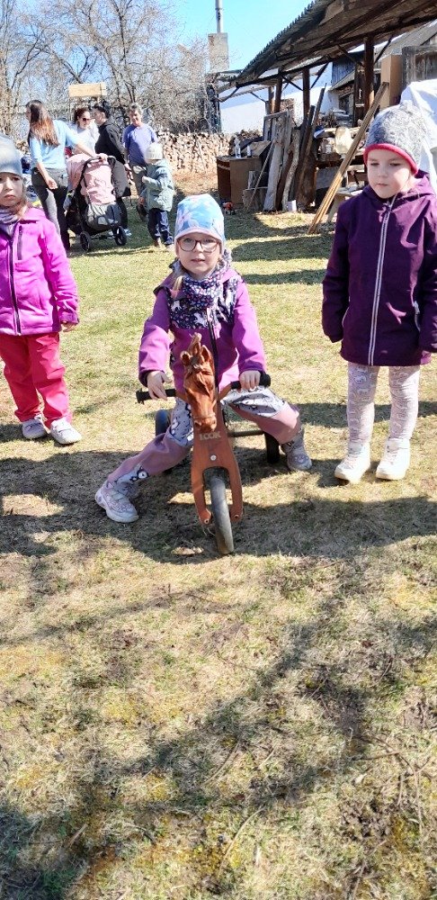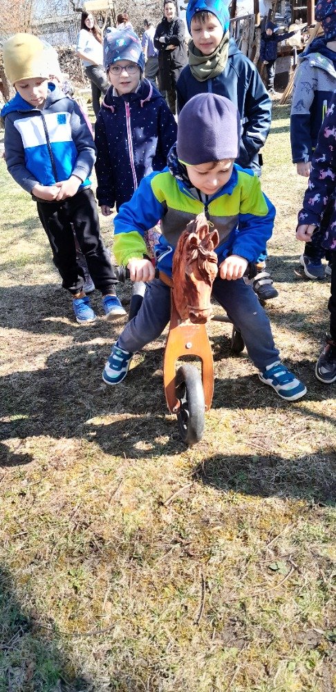 Děti se seznámily s různými nástroji a nářadím, které je potřeba při tvoření ze dřeva. Pan Cigáň jim vše názorně předvedl a také si nějaké nářadí mohly vlastnoručně vyzkoušet. Nejvíc všechny bavilo řezání pilkou. Obdivovali jsme zručnost a nápaditost, s jakou panu řezbáři vznikají krásné kousky pod rukama. Na závěr si děti zajezdily na kolečkovém dřevěném koníkovi.