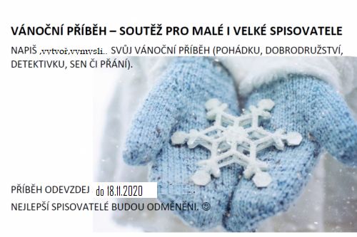 Úkolem je napsat krátký příběh, pohádku o vánočním čase, báseň... cokoliv vás napadne. Akce se můžou účastnit děti samy, nebo tvořit spolu s rodiči či kamarády. Ten nej od nás bude součástí sdíleného adventního kalendáře = pošleme jeden příběh a dostaneme soubor 24 příběhů, které si budeme moct postupně číst každý den od 1.12. do 23.12.