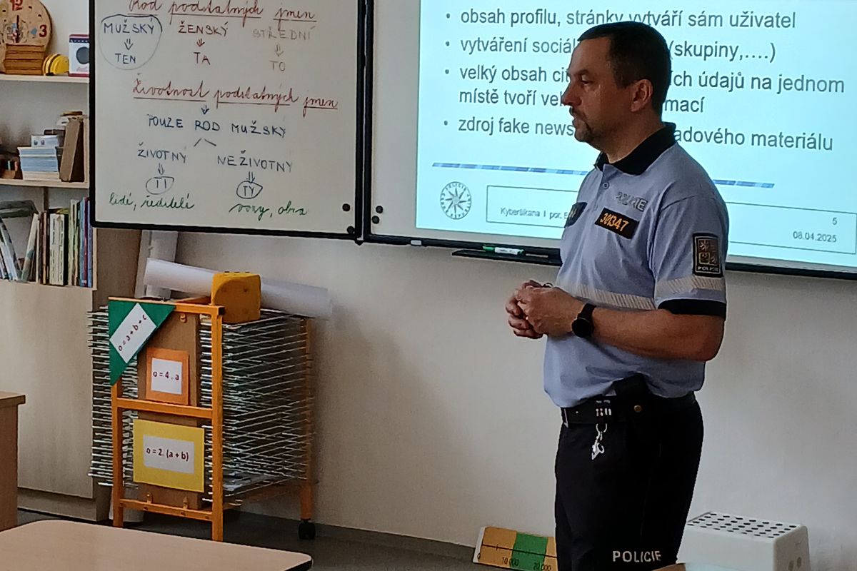 V další části besedy se přednášející policista věnoval tématu kyberšikany. Vysvětlil, co je kyberšikana, a jaké formy může mít. Žáci se naučili, jak se proti kyberšikaně bránit.