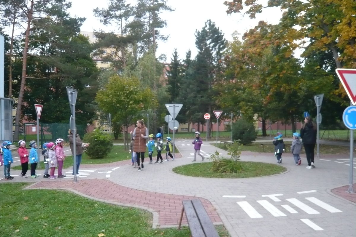 Procvičovali pravidla bezpečného chování – při přecházení vozovky, chůzi po chodníku, jízdě na kole, koloběžce nebo odrážedle. V okolí MŠ jsme se učili poznávat dopravní značky pro chodce i řidiče. Vysvětlovali jsme si podobu semaforů a jejich funkci. Na vycházky jsme používali reflexní dopravní vestičky – děti se seznámily s pravidlem vidět a být viděn.
