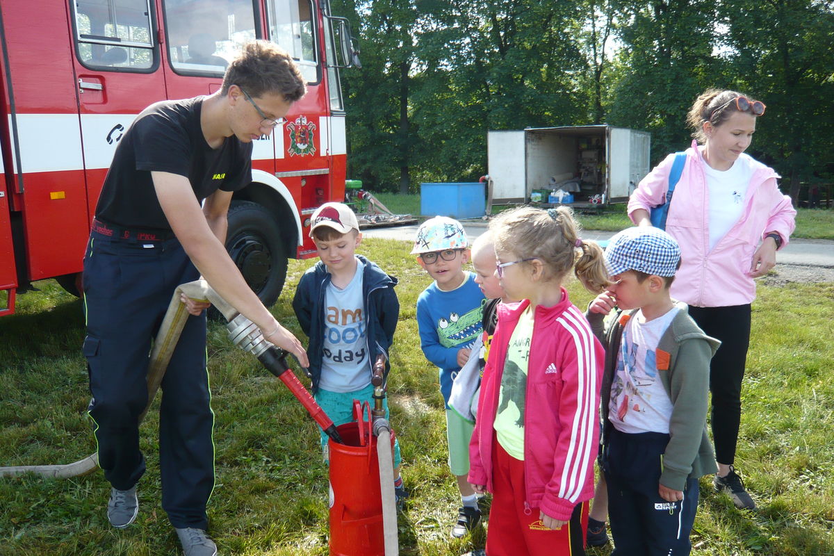 Sešli jsme se v Radějově u čističky, kde měli hasiči pro děti připravena stanoviště s různými úkoly. Každý si mohl vyzkoušet svou odvahu např. při výstupu na žebřík a „záchraně“ plyšového zvířátka ze stromu, zdolávání překážek nebo kladiny. Zručnost a přesnost si děti prověřily házením míčků na cíl, shazováním kuželek pomocí hadice, při stříkání proudnicí na „hořící dům“ a střelbě ze vzduchovky. Také se dověděly při názorné ukázce, jak uhasit hořící olej. Velkým zážitkem pro všechny byla projížďka hasičským autem. Děti za splněné úkoly obdržely nakonec malé dárečky. Za krásné dopoledne a perfektně připravenou akci ještě jednou hasičům moc děkujeme!