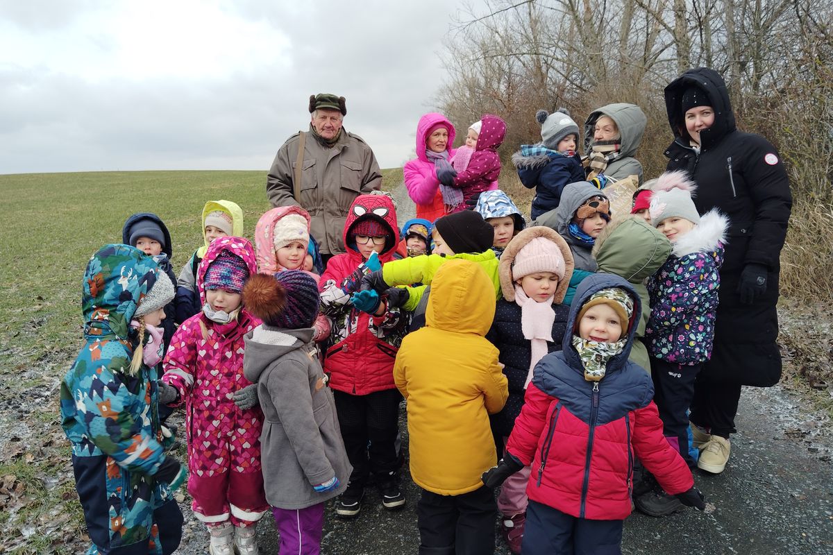 Celý týden jsme se těšili na vycházku ke krmelci. Vedoucí výpravy byl pan myslivec Káčerek s manželkou, která v MŠ dlouhá léta pracovala jako paní kuchařka.
