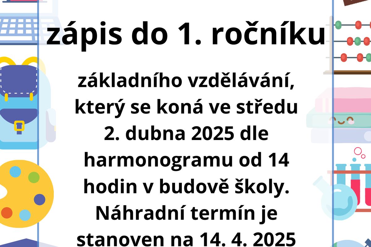 Zápis do 1. ročníku základního vzdělávání se koná 2. dubna 2025 dle časového harmonogramu od 14 hodin v budově školy.