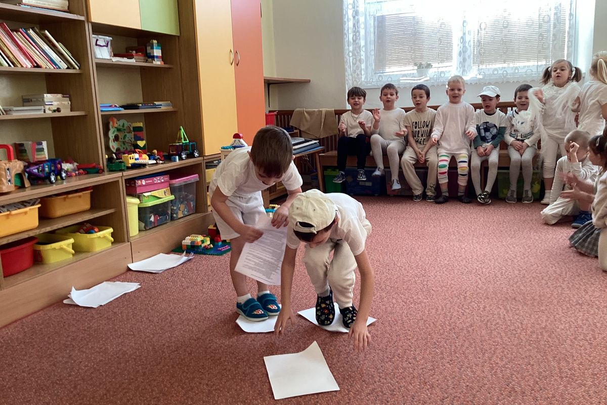 Začátek roku byl na sníh skoupý, ale i tak si děti užily sněhové nadílky už v prosinci. Zkoušely stavět sněhuláky, hledaly stopy zvěře ve sněhu a na vycházkách pozorovaly zasněžený Radějov. Na zamrzlých kalužích jsme zkoušeli klouzat a vysvětlili jsme si, proč je nebezpečné chodit na tenký led. Při pokusu se sněhem a ledem jsme pozorovali, jak se v teple rozpouští na vodu a mění své skupenství. Tvořili jsme zimní obrázky a naučili jsme se spoustu nových říkadel, písniček a pohybových her o zimě. Svou obratnost a dovednost jsme si vyzkoušeli ve školce při stavění iglú z velkých kostek. Vše jsme zakončili „Bílým dnem“ ve školce. Děti přišly oblečeny v bílém ošacení a celé dopoledne jsme prožili hrami, soutěžemi a dováděním.